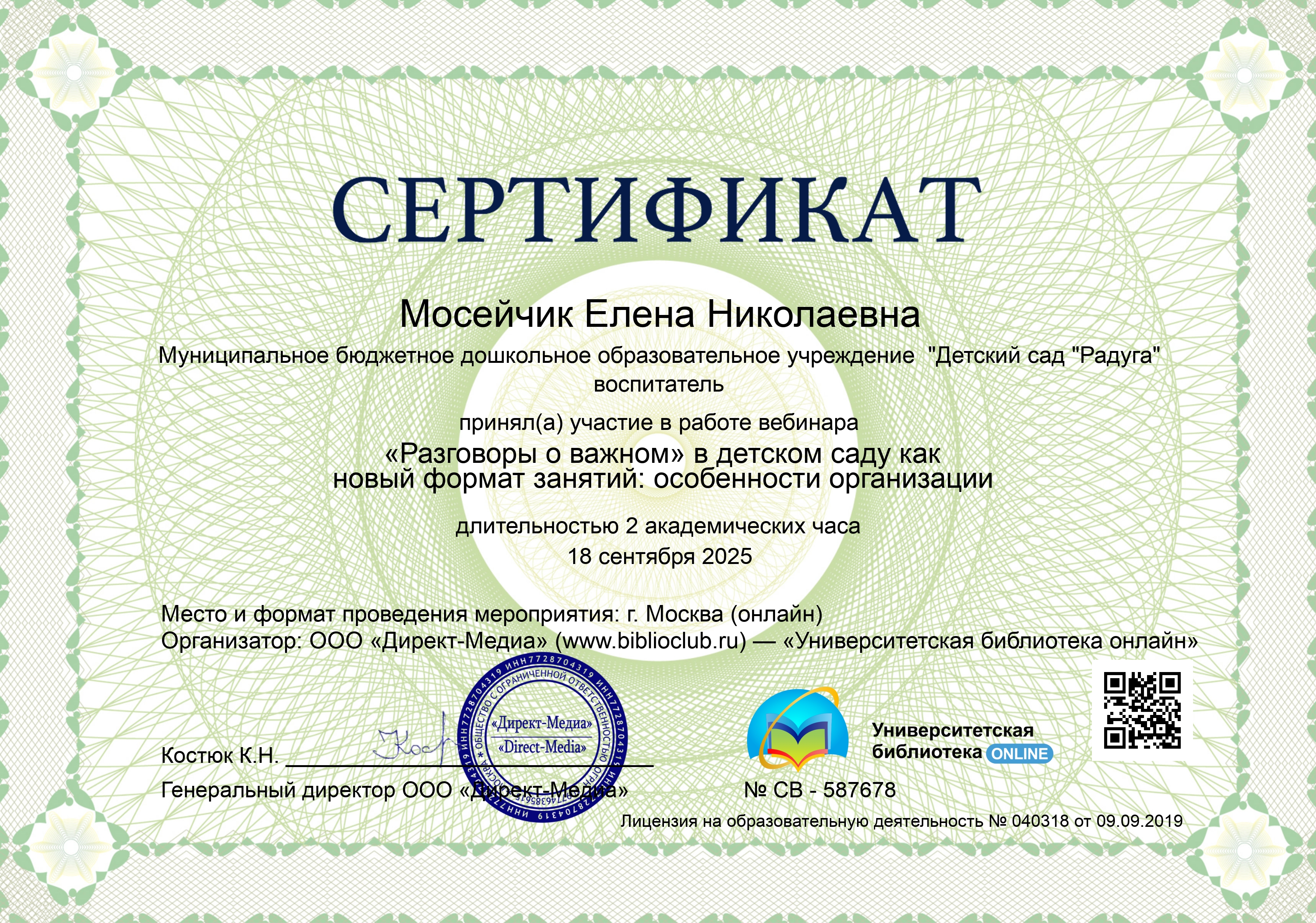 Сертификат участника вебинара "Разговоры о важном" в детском саду как новый формат занятий: особенности организации. 18.09.2025